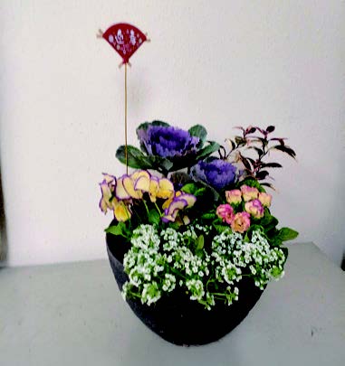 新しい年を迎えるための、華やかな寄せ植えです。お正月のミニ飾り付きです。葉牡丹やずっと咲き続ける植物を植え込むので、お正月が終わった後も春まで楽しめます。管理方法も詳しく説明します。