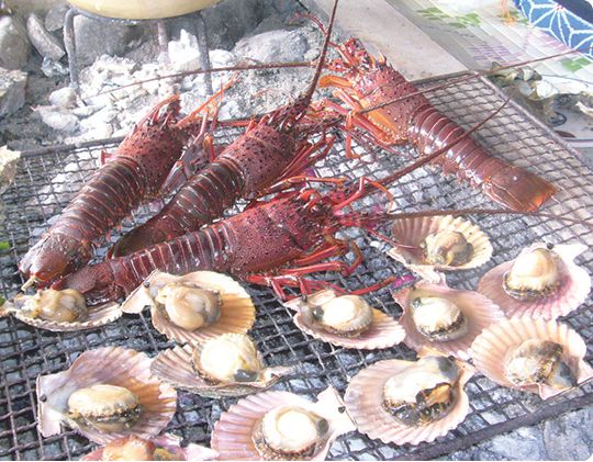海女によるとれたての新鮮な魚介類を目の前で味わえる海女小屋。大海原を眺めながらおいしい料理に舌鼓、食後は女性の願いを叶えてくれる神明神社(石神さん)を参拝します。