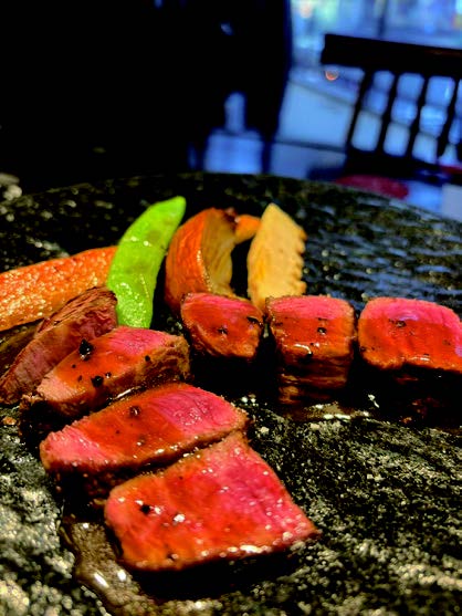 厳選ワインと黒毛和種A4ランク以上のブランド牛『宮崎牛』のランプステーキを堪能。極上の肉質ときめ細やかなサシが特徴で、口に含むとほのかな甘みと芳醇な香りが広がります。